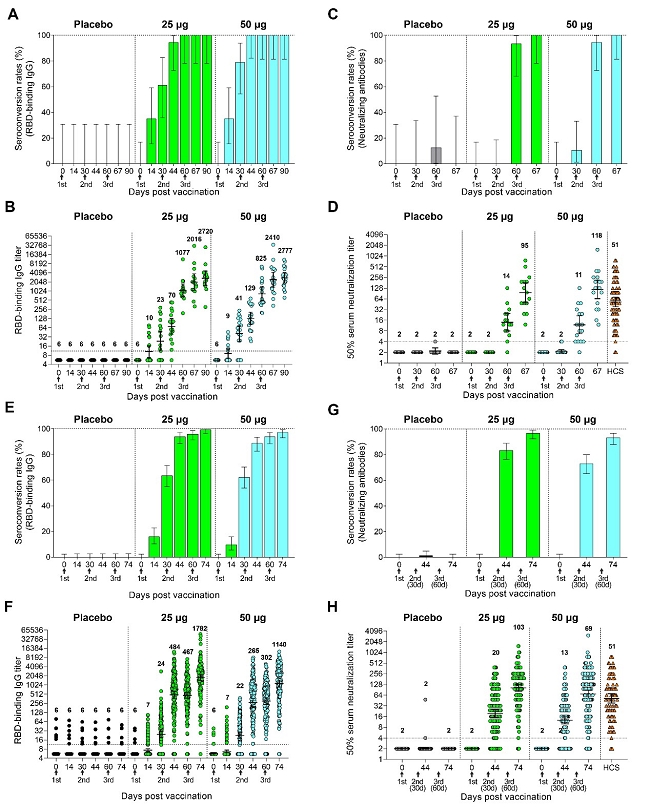 1期临床(A)结合抗体阳转率(B)结合抗体滴度(C)中和抗体阳转率(D)中和抗体滴度;2期临床(E)结合抗体阳转率(F)结合抗体滴度(G)中和抗体阳转率(H)中和抗体滴度。
